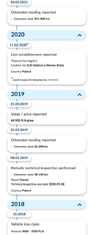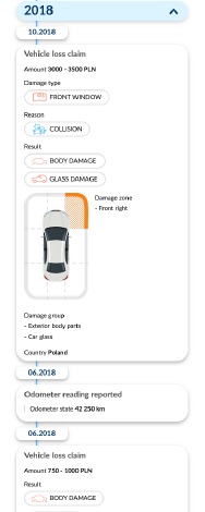 The report makes it possible to verify the titles the vehicle has been given, including the recorded mileage, as well as ownership title entries. You can also gain access to information regarding total losses reported for the vehicle, car dismantling shop reports, accident history and reported cases of the vehicle being stolen. There is one more interesting addition to the report: we offer access to the archived sales offers of the vehicle in the USA.
